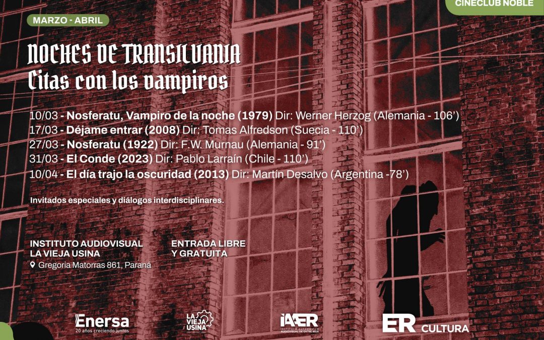 Se trata de Noches de Transilvania / Citas con los vampiros y es organizada por el Instituto Autárquico Audiovisual (IAAER) con apoyo de La Vieja Usina y Enersa. La primera función será este martes 10 en la Sala Noble (Matorras 861, Paraná), a las 20hs. Se proyectará Nosferatu, vampiro de la noche (1979), de Werner Herzog. La entrada es libre y gratuita.
